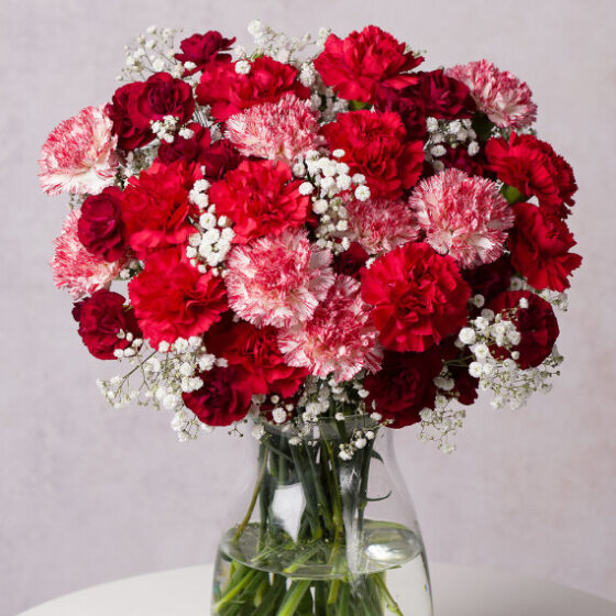 Send a show-stopping arrangement of festive Carnations and Spray Carnations. Featuring a delightful mix of red and two-toned blooms, complemented by delicate Gypsophila, this bouquet is designed to impress. We send our Carnations in bud to ensure maximum vase life and guarantee our Carnations will last for at least two weeks.