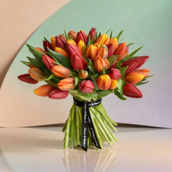 Indulge your senses and try this bunch of red and orange tulips today. Revel in their bright colours and marvel as the stems gradually start to curve and contort, creating that quintessential tulip shape. Hand-tied and elegantly presented for yourself or a friend.