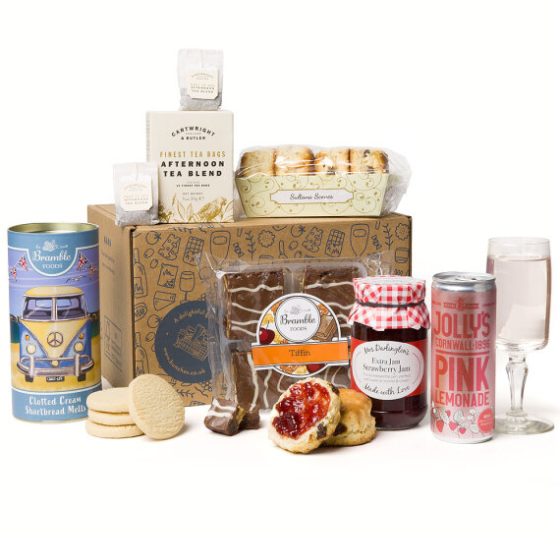 A refreshing twist on the afternoon tea, the pink lemonade makes a fresh addition to the tea and scones (plus other treats!) that make up the traditional arrangement in this hamper. Perfect for a bright summer day! This hamper contains 6 items: Jolly’s Cornwall Pink Lemonade 250ml Cartwright & Butler Afternoon Tea (10 tea bags) Mrs Darlington’s Strawberry Jam 340g Bramble Foods Clotted Cream Shortbread Melts 150g Bramble Foods Sultana Scones x 4 Bramble Foods Tiffin Square x 4 Delivered in a postal gift box.