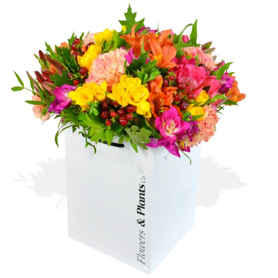 Ride the Rainbow Road and see where it takes you… follow the path less travelled and revel in this vivid mixture of pink & yellow freesias, carnations, alstroemeria and hypericum berries. A bright spark of colour, this bouquet will light up the greyest day with life and lustre.