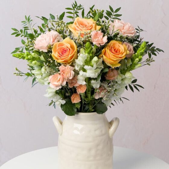An elegant collection of peach Roses and Carnations with complementing white Snapdragon. White Limonium and green Ruscus foliage complete this luxurious display.
