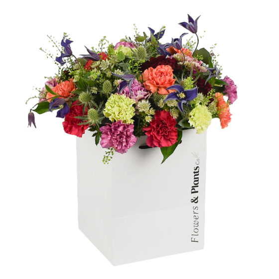 Glowing bouquet, crafted with a medley of vibrant carnations, sure to brighten up any space with its captivating colors. Elevate any special occasion with this stunning and eye-catching arrangement.