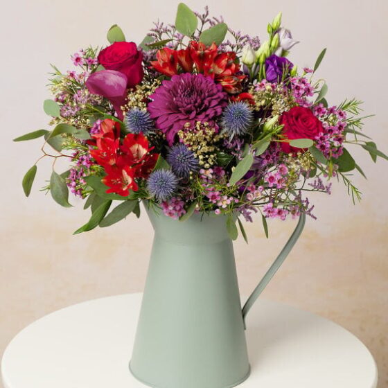 The centrepiece of this Christmas hand tied bouquet is an eye-catching purple Calla Lily paired with red Roses, purple Lisianthus and Alstroemeria. Gold Gypsophila, blue Thistle and purple Wax Flower add a touch of luxury and festivity.